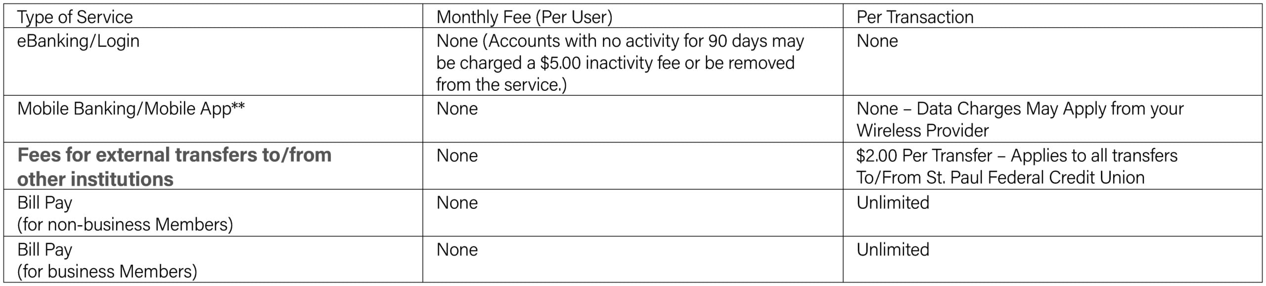 (j) Fees and Charges. The fees and charges for the Services available through St. Paul Federal Credit Union eBanking are set forth later in this Services
